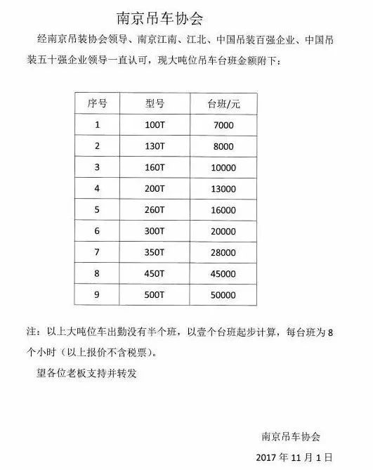 南京吊車協(xié)會(huì)輪式汽車吊價(jià)格指導(dǎo)表,一般根據(jù)噸位按臺(tái)班計(jì)算租賃費(fèi)