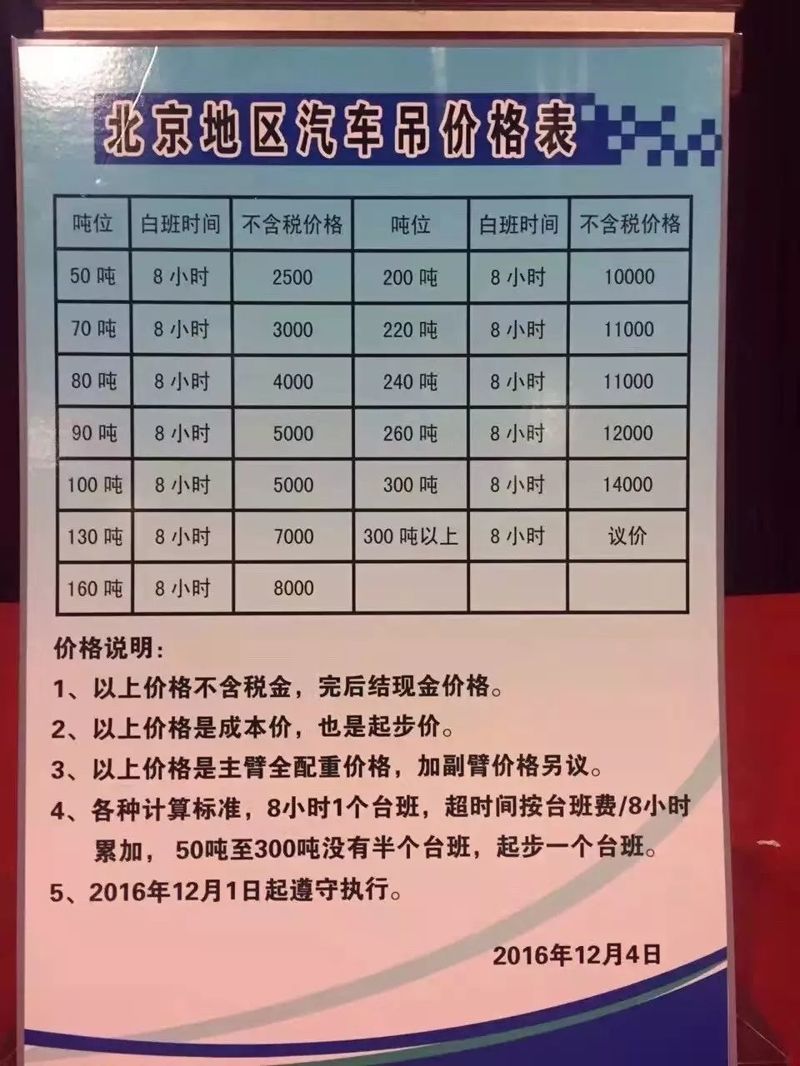北京吊裝協(xié)會(huì)輪式汽車吊指導(dǎo)價(jià)格表,一般根據(jù)噸位按臺(tái)班計(jì)算租賃費(fèi)